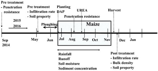 Suitable fields for this study were selected in 2014, and treatments were established in May 2015. Data were collected during the rain phase from July to October 2015 and June to September 2016. An overview of agricultural practices and monitoring conducted throughout the study is shown in Figure 2.