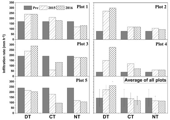 The mean steady-state infiltration rates observed for the years 2015 and 2016 were as follows: 223 and 262 mm hr−1 (DT), 138 and 120 mm hr−1 (CT), and 118 and 115 mm hr−1 (NT), respectively. The infiltration rates in DT were significantly greater in 2015 and 2016 compared to CT and NT treatments (Figure 4).