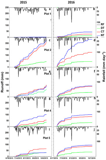 Rainfall (RF) and cumulative runoff for conventional tillage (CT), deep tillage (DT), and no-till (NT) in 2015 (left) and 2016 (right): (a) plot 1, 2015; (b) plot 1, 2016; (c) plot 2, 2015; (d) plot 2, 2016; (e) plot 3, 2015; (f) plot 4, 2016; (g) plot 4, 2015; (h) plot 4, 2016; (i) plot 5, 2015; and (j) plot 5, 2016. The locations are given in Figure 1.