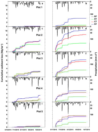 Rainfall (RF) and cumulative sediment loss for conventional tillage (CT), deep tillage (DT), and no-till (NT) in 2015 (left) and 2016 (right). (a) Plot 1, 2015; (b) plot 1, 2016; (c) plot 2, 2015; (d) plot 2, 2016; (e) plot 3, 2015; (f) plot 4, 2016; (g) plot 4, 2015; (h) plot 4, 2016; (i) plot 5, 2015; and (j) plot 5, 2016. The locations are given in Figure 1.