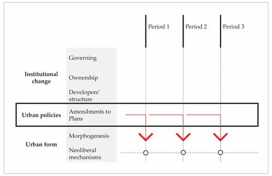Morphological studies usually deal with the change of urban form, identifying the time when the change occurred and the extent of the transformation. This research differs from these usual studies, as the periods were derived based on an analysis of the institutional framework, while the change in urban form was discerned by an analysis of changes in land ownership and land-use. On the other hand, observing the studies predominantly concerned with the analysis of the institutional framework and changes in the planning system, this research stands out as it strives to identify, monitor, and present the changes using spatial parameters found through a particular case study.