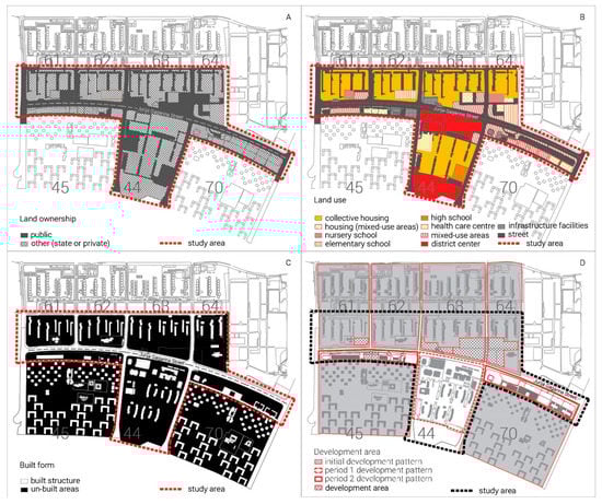 Morphogenesis of Jurija Gagarina Street, period 2: (A) Land ownership, (B) land-use, (C) built form, and (D) pattern of growth (source: authors).