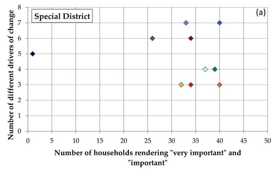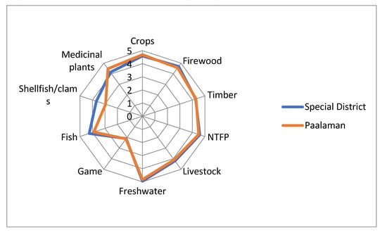 Figure 6 shows how the different drivers are related to the importance attached by the local resource users. We see that multiple drivers of change affect highly important provisioning services for the locals in the two villages (Table 3). The number of drivers of change affecting different provisioning services remains the same in the two villages. Both for Special District and Paalaman, fish, crops, water, and timber are affected by a higher number of drivers of change (5 to 7 drivers) than NTFPs, medicinal plants, firewood and livestock (3 to 4 drivers). Special District shows important provisioning services provided by shellfish and clams are affected by 6 different drivers of change. It is assumed that the involvement of more number of different drivers affecting a particular provisioning ES means the increase of threat to that ES. Also, the multiple drivers indicate the unpredictability and complexity involved with changes associated with the ES [,].