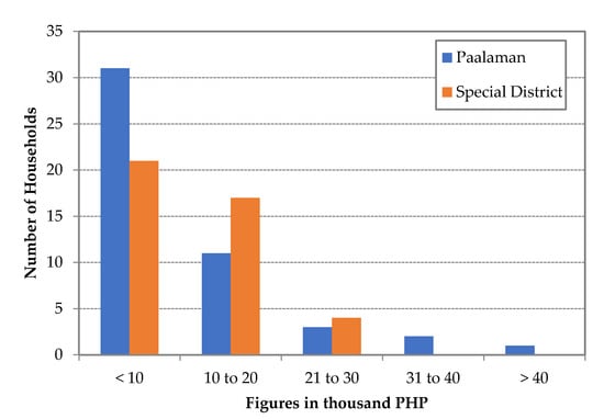 Moreover, judging from the average monthly income from our survey, we found that local resource users in our study in both the villages had similar kind of socioeconomic situations. However, Paalaman had slightly poorer households as 31 of 48 households (about 66%) lived below PHP 10,000 per month compared to 21 of 42 households (50%) in Special District. About 59% of the surveyed households, mostly consisting of farmers, fishers, and small business owners, earned less than 10,000 PHP2 per family (average 9438 PHP). The lower-income level in the two villages showed that a considerable portion of the relatively economically poorer households relied on the “free” provisioning services from these diverse landscapes (Figure 5).