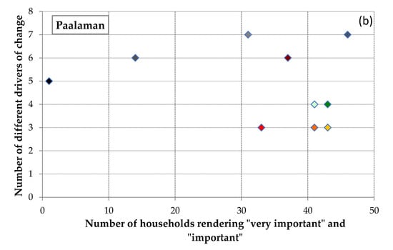 The relation between drivers of change and importance values attached to ecosystem services (ES) by local resource users in the two villages, (a) Special district (N = 42) and (b) Paalaman (N = 48). The colors denote different provisioning services (See Table 3 for details).