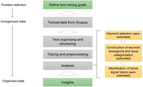 Figure 3 presents the research process of this study. The process starts with a problem definition, which, in this case, is the identification of future signals of the land administration domain, after which the text mining exercise is implemented. At this point, it should be stressed that text mining, albeit being a quantitative approach, rarely is a linear and fully automated procedure, but requires actions and revision from the text miner as well []. After all, text mining shares similar features with content analysis as the goal is to extract common themes and topics from a text corpus, and that might require adding and/or deleting categories based on a manual selection. Performing text analysis requires setting up a text mining framework []. Usually, the following four steps should be included. The first step is to import texts into the computing environment. The second step is organizing and structuring the imported texts to access them in a uniform manner. Next, the text corpus requires tidying and preprocessing. This includes removing stopwords, tokenizing texts, and so on. The preprocessed texts must also be transformed into structured formats that make analysis possible. In the fourth step, the analysis can be performed with adequate methods. Finally, after the text analysis part has been completed, the results are formulated into insights.