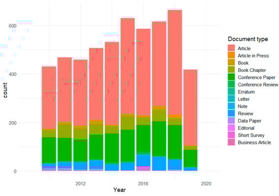We used “land administration”, “cadastral system”, “cadaster”, and “land administration system” as search keywords, and limited the search to documents published or accepted for publication between 1 January 2010 to 4 October 2019. The total amount of documents that were retrieved from Scopus was 5311. For each document, we were able to identify a title, authors, author keywords, a journal name, a publication year, and an abstract. As can be seen from Figure 4, the number of articles handling land administration issues has increased steadily during the past decade. Figure 4 also shows that research articles are the dominant document type in this data set, followed by conference papers as the second most common type. To further validate the relevance of the collected documents, we examined the author keywords by simply counting their total amount (see Appendix A for a list of thirty most common author keywords). “Cadastre” is the most common author keyword, followed by “GIS” and “land administration”. Also, more specific author keywords such as “remote sensing”, “3D cadaster”, and “LADM” belong to the top of the list. Overall the most popular author keywords are well in line with current discourses within the domain.