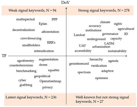 Even though some manual merging of the topics was done, we did not want to intervene the outcome of LDA too much. Therefore, some overlapping of the signal topics can be observed, for instance, in the use of satellite imagery and NPP for collecting information about socio-economic variables. The most prominent feature of our findings is the large share of strong signal topics. Reasons for this could lie either in the study approach and the used text mining tools or the mere fact that the discourses of the land administration domain tend to cluster around certain topics. Regardless, we find the identified signal topics highly plausible and versatile, as they vary from climate, biodiversity, and transportation to sensor technologies, land conflicts, and standardization. This just underlines how land is a component that connects to many grand challenges we are facing today, and how land administration functions (land tenure, land value, land development, land use) [], are in a key role in delivering the sustainable development goals (SDG) set for year 2030 [].