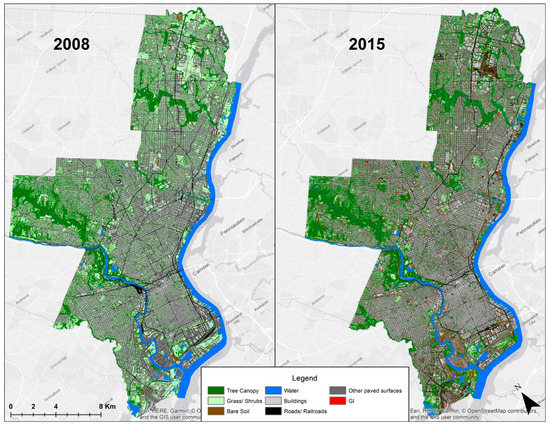 Landcovers of Philadelphia in 2008 [40] and 2015 featuring green infrastructure.