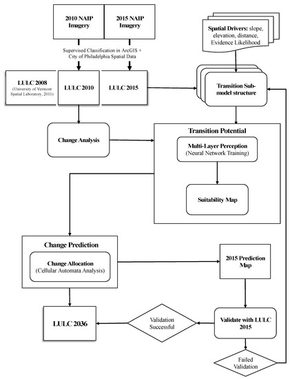 Processes involved in the Land Change Modeler (LCM) to create and validate the 2036 LULCC of Philadelphia.