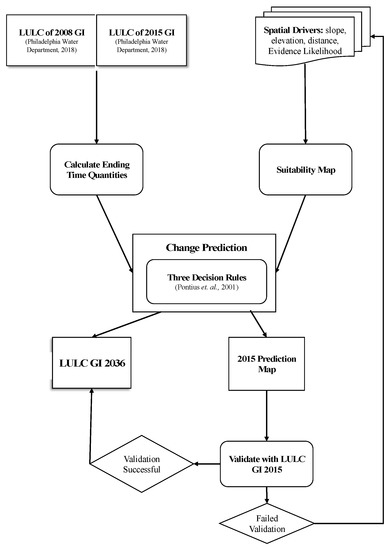 Using detailed landcover models at a 1 m resolution, this study aims to model GI policies in Philadelphia, Pennsylvania, USA, and the resulting LULCCs from new GI and continued urbanization for the year 2036. A hybridization of GEOMOD and the LCM was used to model future changes in GI and urbanization, respectively. The model is driven by patterns of historical change, conservation and development constraints, the physical landscape, and distance variables. The model is validated using Kappa statistics and disagreement scores, and the landcovers are compared using a variety of spatial metrics.