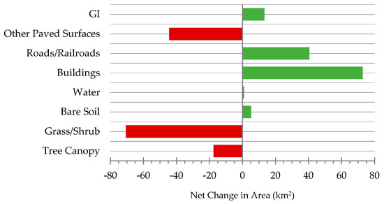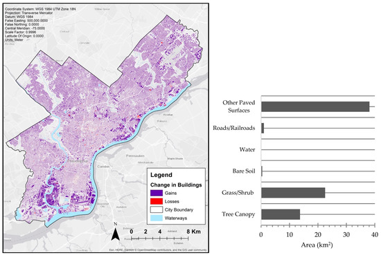 Buildings demonstrate a large net increase of almost 73 km2 (Figure 5). A small reduction in buildings is due to new GI (Figure 7). Similar to increases in GI, most of the gains in building area are predicted to result from a loss in other paved surfaces, followed by grass/shrubs and tree canopy (Figure 8 right). It is forecasted that the new buildings will be well distributed throughout the city, with some concentration in south Philadelphia (Figure 8 left).