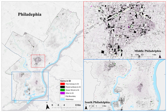 Map of the increase in GI from 2008 to 2036 broken down by category. The middle and southern portions of Philadelphia are highlighted (“Other to GI” includes buildings, soil, and roads/railroads transitioning to GI).