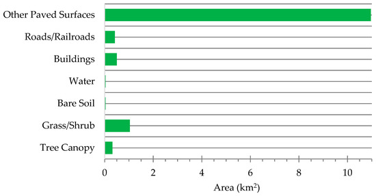 The final 2036 landcover is featured in Figure 4. Overall, buildings are predicted to exhibit the largest net increase, followed by roads/railroads by 2036 (Figure 5). Grass/shrubs are predicted to exhibit the largest net decrease, followed by other paved surfaces by 2036 (Figure 5).
