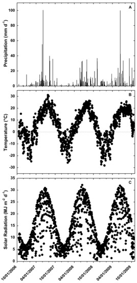 Daily precipitation (A), daily mean air temperature (B) and daily total solar radiation (C) 2 km from study site from 18 October 2006 through 23 October 2009.