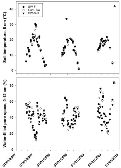 3.1.2. Soil Temperature and Water-Filled Pore Space