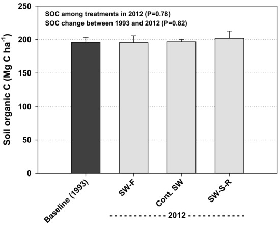 Soil organic carbon values assimilated stocks across an approximate 1.22 m depth using an equivalent mass calculation method. Accordingly, SOC stocks encompassed the rooting profile for crops included in the study [40]. Mean SOC stocks were 195.6 ± 6.8 Mg C ha−1 in 1993 prior to treatment deployment (Figure 3). Eighteen years later mean SOC stocks were 198.0 ± 4.6 Mg C ha−1 and did not differ from baseline stocks (P = 0.82). Moreover, SOC stocks in 2012 did not differ among cropping systems (P = 0.78), with mean values of 195.4 ± 10.3, 196.7 ± 3.5 and 201.8 ± 10.9 Mg C ha−1 for SW-F, CSW and SW-S-R, respectively (Figure 3). Substantial variation in SOC stocks were observed across replications, ranging from 175.1 to 208.2 Mg C ha−1 in SW-F, 193.0 to 203.8 Mg C ha−1 in CSW and 187.1 to 223.2 Mg C ha−1 in SW-S-R. No differences in inorganic C were observed among treatments in 2012 (data not shown).