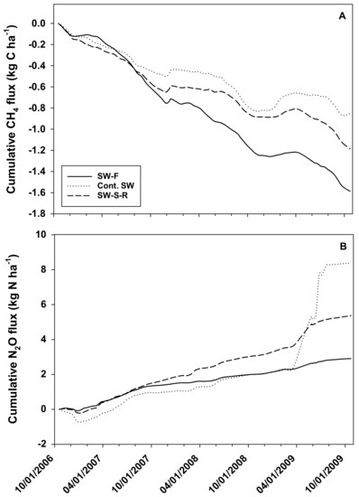Cumulative flux of CH4 (A) and N2O (B) for spring wheat–fallow (SW-F), continuous spring wheat (Cont. SW) and spring wheat–safflower–rye (SW-S-R) cropping systems from 18 October 2006 through 23 October 2009.
