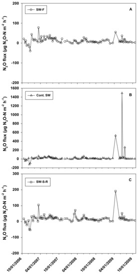 Nitrous oxide flux for spring wheat–fallow (SW-F; (A)), continuous spring wheat (Cont. SW; (B)) and spring wheat–safflower–rye (SW-S-R; (C)) cropping systems from 18 October 2006 through 23 October 2009. Mean values are reported across crop phases for SW-F and SW-S-R.