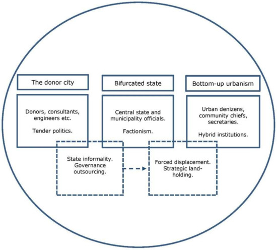 Figure 2 provides a tentative conceptual representation of the urban geopolitical dimensions identified in the research. Each of the dimensions represents a distinct set of actors and organizing principles which have shaped the production and control of urban space in Beira. As demonstrated by the research findings, these dimensions are by no means reflective of coherent interests and are highly contentious. Beneath the three dimension two additional spaces have been depicted representing new contentions which have emerged in the encounters between these dimensions. The space on the left shows how donor engagements with the (bifurcated) state have produced new forms of state-informality, while simultaneously leading to the outsourcing of urban development. These encounters have served to further exacerbate the ambiguity of urban governance and the associated roles and responsibilities. Depicted on the righthand side are the encounters between the state (i.e., the municipality) and bottom-up urbanism which have produced dynamics of forced displacement as well as strategic land holding on behalf of urban denizens. As demonstrated by the connecting arrow, the second space is closely related to the first, with donor engagements giving additional momentum to the consolidation efforts of the municipality.