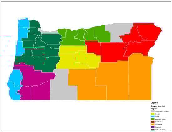 - Oregon Department of Agriculture. Oregon Agricultural Regions; Oregon Department of Agriculture: Salem, OR, USA, 2017.