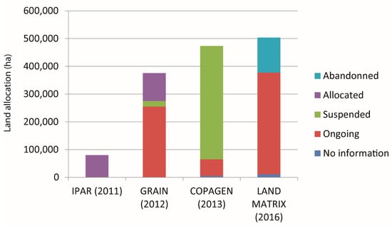 30]. Global databases assemble the declarations of interest in land investments and allow for cross-country comparisons, but they do not necessarily provide precise indicators that can identify areas with verifiable production. For instance, in the case of the Land Matrix, even if precise information can be crowdsourced for certain case studies, this level of precision is not consistent across the whole database. Scoones et al. advocate for more local studies and ground-truthing processes to analyze the LSLA (large-scale agricultural land acquisition) phenomenon beyond the accumulation of hectares. The authors underline that accessing authentic data could come from participatory action-research initiatives, with “researchers being the conduits for local voices rather than replacing them” [