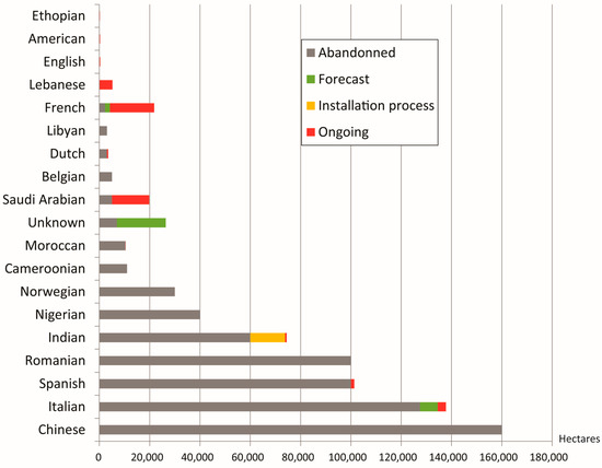 41], despite the fact that the phenomenon of land grabbing is often exclusively attributed to investors from rich countries or countries linked to sovereign wealth funds (e.g., China, Saudi Arabia). Certain sources take into account the investments that are made by politicians, religious leaders, farmers, or local business men, whose investments are similar to foreign investments [