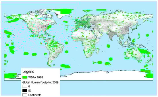 - Jones, K.R.; Venter, O.; Fuller, R.A.; Allan, J.R.; Maxwell, S.L.; Negret, P.J.; Watson, J.E.M. One-third of global protected land is under intense human pressure. Science 2018, 360, 788–791. [Google Scholar] [CrossRef] [PubMed]