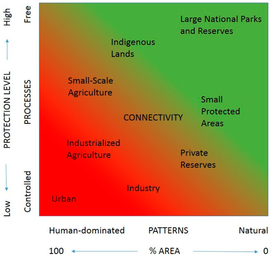 Conservation biology started in the 1980s as a discipline focused on the non-human world and anthropogenic threats to diversity. As realities of conservation have become more apparent, the field has become much more inclusive of research on humans in and around protected areas as more than mere threats but in some ways, mechanisms for conservation (Klein et al. 2008 [37]; Powell et al. 2009 [38]). Thinking about the matrix in which protected areas sit, and how human activities outside protected areas can influence their effectiveness, contributes to a holistic view of landscapes moving from discrete areas of management and protection to working across the entire gradient of land uses (Anderson et al. 2012 [39]; Cushman et al. 2010 [40]). A view that protected areas are at one end of a management spectrum with intervening areas managed across a gradient of human activities has emerged so that a holistic, landscape view of habitat and permeability becomes more in focus. More area needs to be set aside, but the emerging view is that people’s livelihoods and wellbeing be considered as part of the conservation equation if biodiversity protection is to be sustainable, and at the same time these matrix activities can be managed and directed to be less harmful and even beneficial for core protected areas.