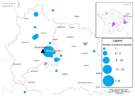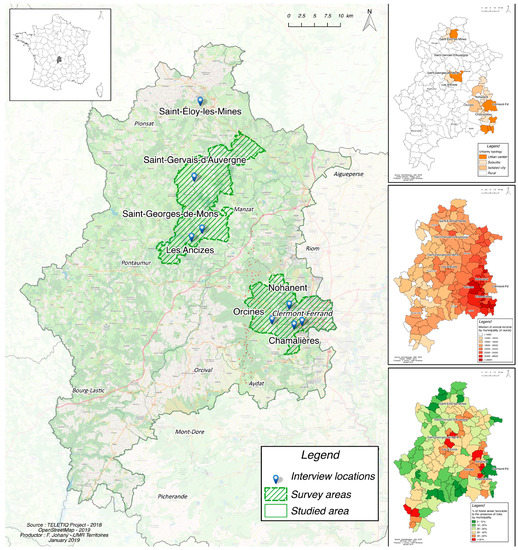 The data were collected in France between February and July 2018 by two investigators on eight sites around the city of Clermont-Ferrand and the region of Combrailles as shown in Figure 1.