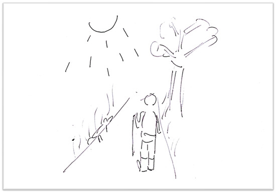 The fourth class (cluster 4 of the dendrogram) groups together 40 drawings. Numerically, this is the second largest class of drawings. It is similar to class 1 in the sense that it strongly emphasizes the presence of vegetation cover (especially trees), animals, and pathways. This class is also characterized by the absence of buildings, however, its drawings often depict the presence of humans and/or ticks, where the interviewee describes himself (or humans in general) in a more precise place in the TBR environment. In these drawings, we can see that the human becomes the central element in the perception of the path crossing a plant cover along with the presence of pets. The drawing in Figure 7 is typical of this class.