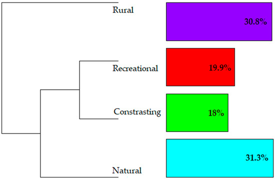 The hierarchical classification identifies two main classes (class 1 and class 4) accounting for nearly 68% of the drawings. Both classes are largely based on the representation of a pathway crossing a vegetation cover that frequently includes an image of pets. These are therefore the central elements in the interviewed population’s representation, which is more often a depiction of a wild and less anthropized nature. This is contrary to the depictions in the third class, which present a representation of TBR corresponding to the proximity with buildings and/or places of leisure. The second class remains the most remote by virtue of its minimal or absent spatial character, where the image of a landscape less pronounced.