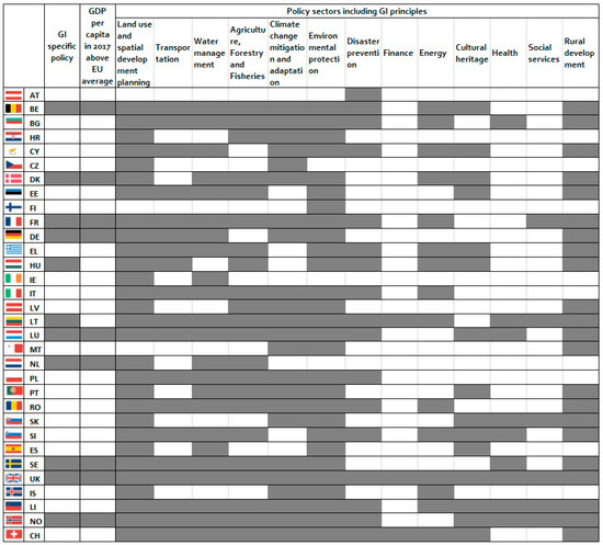 Despite different ways of implementing the European GI strategy, the respondents in this study indicated a common understanding of the concept. Respondents from most countries included green areas and the interconnectivity between them. Some respondents mentioned blue areas. Respondents from Iceland and the UK also included policy measures for green transition. The study indicates that the 32 European countries integrate GI in one or more policy sectors, especially in the 11 countries that have developed or are developing GI-specific national strategies. The analyses in this article suggest that a more systematic coordination of policy could lead to a further and wider implementation of GI in various policy sectors. Targeted coordination per sector and national GI-specific policies would help achieve the multifunctional nature of GI to a greater extent. Further study is needed of whether sectoral policy coordination would be best achieved by focusing on the five sectors that already seem to include principles for GI (water management; agriculture, forestry and fisheries; climate change adaptation and mitigation; environmental protection; rural development) [1,2,17,38,39,40] or by focusing on the policy sectors that seem to lack such principles (finance, energy, health, social services) [5].