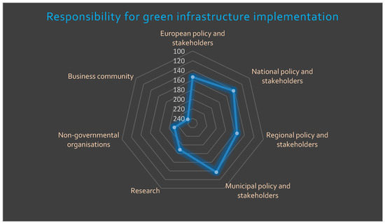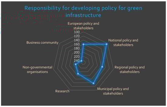 The responses about responsibility for both policy development and the implementation of GI in this study confirm that GI is mainly considered to be the responsibility of the various levels of government [1,20]. Which level is seen as having the main responsibility differs from country to country. The responsibility of the actor group of land owners (e.g., gardeners, foresters and farmers) is not explicitly included in the questionnaire. Although not indicated by our respondents, indications from media debates in countries such as Sweden, Denmark and the UK suggest that it is important to acknowledge the role of land owners in analyses regarding the responsibility for implementing GI and maintaining the environmental qualities of their land. Farmers, foresters and other private land owners were assumed to be part of the actor group ‘business community’ in this questionnaire. As agriculture has been called ‘the elephant in the room’ [53], to not focus the questionnaire more on this actor group is a shortcoming that future studies of GI are recommended to address.