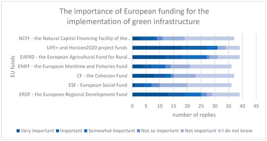 Financial measures are important for preserving, restoring and developing green and blue areas and for enhancing their qualities and uses [15,50,51]. The respondents ranked the importance of different funding sources for implementing GI measures based on a list of seven European funds (Figure 4).