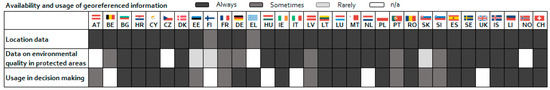 The results for financing GI via EU funds are also based on individual responses, not countries (Figure 4). The questions regarding georeferenced information on protected areas and its use in spatial planning are presented per country (Figure 5). These questions were answered by 40 respondents online (questions 8, 11, 12 and 13 in the survey).