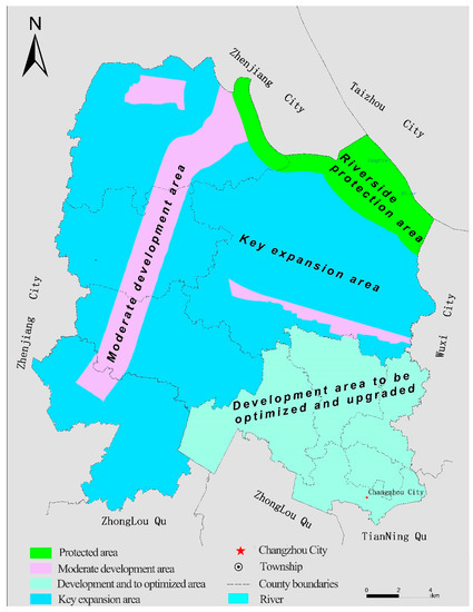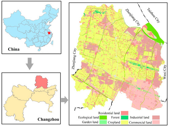 Xinbei District is located in the northern part of Changzhou, Yangtze River Delta in China, with the Yangtze River in the north, and the Shanghai-Nanjing Railway in the south (Figure 1). This is a superior location due to its connection with cities such as Suzhou, Wuxi, and Zhenjiang, and is equidistant to the three megalopolises of Shanghai, Nanjing, and Hangzhou.