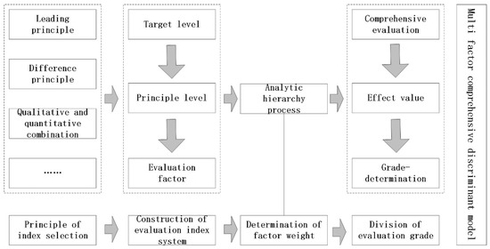 The establishment of the model mainly consisted of three steps: index system construction, index weight determination, and evaluation result analysis as shown in Figure 3. First, based on the constructed index system, 21 explanatory factors representing natural and social features were used. The weight of each evaluation factor determined by AHP was converted into dimensionless indices. Then, the result was the construction of an integrated Multi-Factor assessment model for the evaluation of Xinbei District’s RECC. Finally, according to the meaning of the evaluation object determined by comprehensive evaluation, the results were classified into different levels to reflect its capacity in sustainable development of the ecological environment.