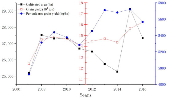 Figure 5. Food production trend of Xinbei District (2007–2016). - Total food production estimation. According to the above estimation of farmland area and food yield per unit area, the total food production of Xinbei District in 2035 and 2050 is estimated, as shown in Table 4.