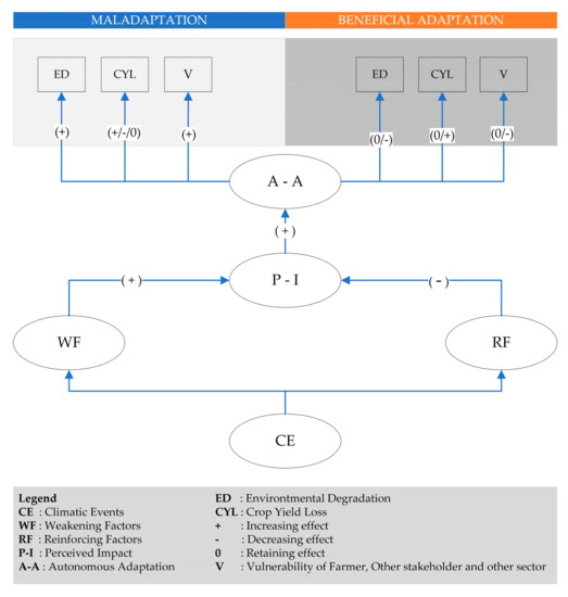 A farmer’s perception of climate risk is essential because it represents the degree of perceived impact (P-I)—a measure of how a farmer personally feels about the impact of a particular occurrence [12,13]. Past exposure to climate-related disaster increases the degree of P-I, which in turn drives farmers to undertake adaptation actions [14,15]. While some studies stressed the benefits of autonomous adaptation, other studies reported that it ultimately results in unintended maladaptive outcomes, such as increasing the farmer’s vulnerability to CC, shifting the vulnerability to other stakeholders or sectors, and decreasing the quality of common pooled resources [16,17,18,19]. Thus, assessing a farmer’s P-I toward CC is essential in two aspects: First, it provides valuable information about the efforts to encourage autonomous adaptation; second, it provides crucial insight into the effort to avoid maladaptation practices. As most developing countries have a national adaptation policy [20], this study contributes to addressing the question of which farmers should be prioritized and through what channel the content of a policy should be delivered. Figure 1 shows how climate risk perception is related to autonomous adaptation and adaptation outcome.