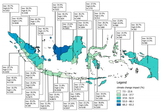 We used a nationwide rice farming survey in Indonesia administered by the Indonesian Bureau of Statistics (BPS). The survey was conducted from May 2014 through June 2016 and covered a sample of 87,330 rice farm households (RFHs). The sample selection involved two-stage stratified random sampling. In the first stage, the national BPS office randomly selected census blocks from a total of 844,946 blocks and obtained 8933 sample blocks. Only census blocks with 10 or more RFHs were considered eligible for sample selection. In the second stage, the district BPS office stratified RFHs by land size. Only RFHs with a land size no less than 550 m2 for lowland rice and 100 m2 for upland rice were eligible for sample selection. Figure 2 shows, for each province in Indonesia, the distribution of sample RFHs and the percentage of farmers who experienced the effects of CC.