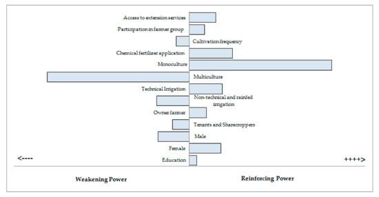 The identification of factors affecting the degree of a farmer’s P-I of CC was the primary purpose of this study. The estimation results in Table 2 show the effect of each variable. The variables were further classified into weakening and reinforcing factors. A reinforcing factor decreases the degree of P-I, whereas a weakening factor increases it. Figure 3 summarizes the reinforcing and weakening factors.