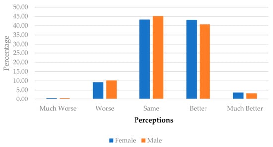This finding suggests that the gender effect is context- and location-specific. In this study, female farmers perceived a lower degree of impact. Based on the data, female farmers participate more in crop insurance than male farmers. The participation rate of female farmers in crop insurance is 0.255%, whereas that of the male farmer is 0.192%. Women farmers have a more positive perception regarding future farming conditions. Figure 4 shows the distribution of farmer perception of future farming conditions.
