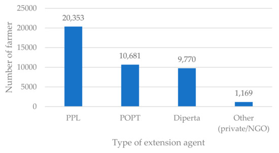 Indonesian farmers receive extension services from several sources, such as state agricultural extension officers (PPL), a state pest-control officer (POPT), an officer from the office of agriculture at the district level (Diperta), and private extension services. Figure 5 shows the number of farmers who receive extension services based on the type of extension service officer. Only 25% of rice farmers in Indonesia have access to these services. The primary extension agent is from the government. The data shows that non-government extension agents vary in type, and these may be from a private corporation (such as a pesticide and fertilizer factory), a non-governmental organization (NGO), or may be associated with peer-farmer extension. Increasing the number and coverage of extension agents is essential for CC adaptation policy in Indonesia, since the majority of farmers (41%) receiving extension services are concentrated in Java, with 21.4% in Sumatera, 8.3% in Bali and Nusa Tenggara, 10.6% in Kalimantan, 14.4% in Sulawesi, and 1.2% and 1.9% in Maluku and Papua, respectively.