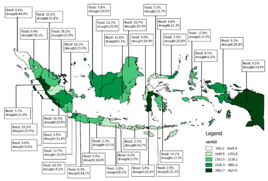 The distribution of farmers experiencing flood and drought in each province of Indonesia (the rainfall intensity unit is mm/year).