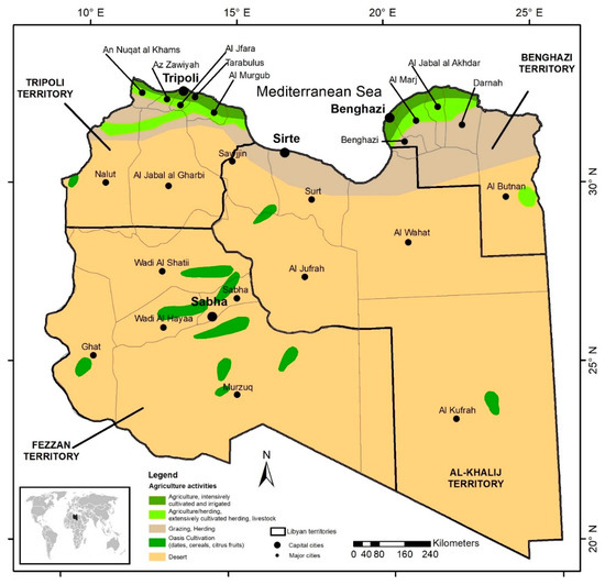 - University of Texas libraries, Thematic Maps: Libya—Economic Activity. Available online: https://legacy.lib.utexas.edu/maps/libya.html (accessed on 11 December 2018).