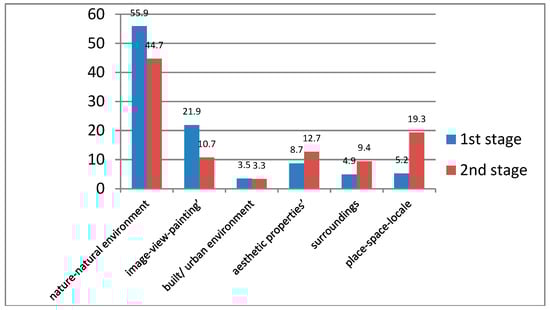 The predominance, then, of the natural and aesthetic qualities in these students’ notions of landscape, as well as their stated belief that landscape becomes through observation, resonates with numerous landscape studies and research results, as well as widely held scientific convictions about landscape (Meinig, 1979 []; Tuan, 1979 [] (pp. 89–102); Jackson, 1980 []; Rose, 1996 [] (pp. 341–350)). Moreover, the ELC, which may have played a role in these students’ notions of landscape, states so clearly. Such findings only slightly change in the 2nd stage of our research; they are rather somewhat adjusted and balanced, vis-à-vis those of the 1st stage, pointing to trends of more developed, educated and well-rounded landscape-related notions and practices (Figure 1 and Figure 2). More analytically, in the five years intervening between our two research stages, the interviewed students’ landscape notions of landscape have become more educated, nuanced, inclusive/comprehensive, balanced and indicative of an increased sense of consciousness and sensitization towards both landscape, in general, and their campus landscape, more specifically. Such findings accord with a general increase in the development of a lay environmental conscience in Greece in the past few years, generally speaking, a trend that is also demonstrated in the answers to certain questions of our questionnaire; the latter findings are more pronounced in the case of female students and those of an urban permanent residence. Furthermore, another emerging trend is a stronger sense of the aesthetic dimension of landscape (Figure 1), which seems to preoccupy these students increasingly positively in the 2nd stage of our research rather than in the 1st, and especially so the architectural students.