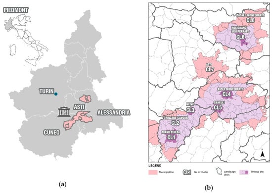 For the present evaluation, the Municipalities of the LRM landscape have been organized into 8 clusters that are included in the core zones and the buffer zones of the UNESCO site (Figure 2): Cluster 1 (Diano d’Alba), Cluster 2 (Grinzane Cavour), Cluster 3 (Neive), Cluster 4 (Nizza Monferrato), Cluster 5 (Canelli), Cluster 6 (Rosignano Monferrato), Cluster 7 (Asti), and Cluster 8 (Casale Monferrato).