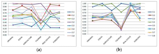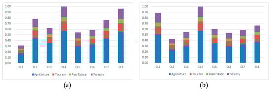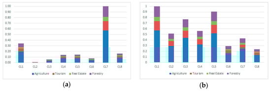 Moreover, as it can be seen in the first diagram (see Figure 3a), the agriculture index (A) shows a major influence in clusters 4, 7, 8 equal to 0.300. The tourism index (T) reaches the maximum value in CL5, equal to 0.180, because of the touristic tendency. The real estate index (R) has a major influence in clusters 2, 5, 8 (values ranged between 0.180 and 0.070) and lowest values in clusters 3 and 4 (equal to 0.040); the forestry index (F) is the most important in these clusters (values ranged between 0.150 and 0.180).