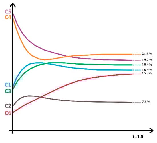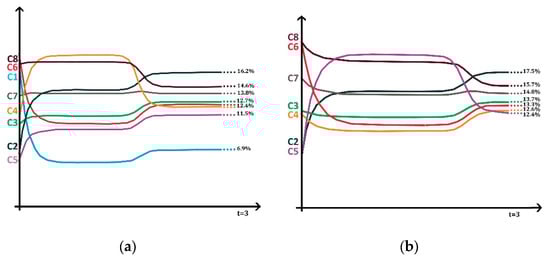 In Table 7, the percentage values of population in early, temporary, and final times are shown. It has to be noticed that the time scale is arbitrary, so Figure 5a,b show only an asymptotic trend of each population. The historical series about the population dynamics are necessary to fix an actual time scale. Such evolution can be seen also in Figure 5.